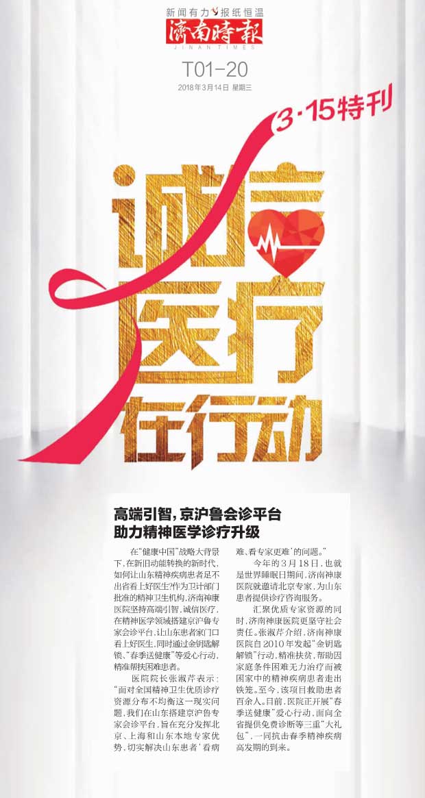 “康复一个患者,幸福一个家庭”,济南神康医院坚守“承担共同责任 促进精神健康”的国家健康战略,坚守诚信医疗底线,让精神疾病患者有尊严地接受治疗。在2018年3·15国际消费者日到来之际,济南时报《诚信医疗3·15》特刊对济南神康医院京沪鲁专家会诊平台和金钥匙解锁救助行动展开专题报道。